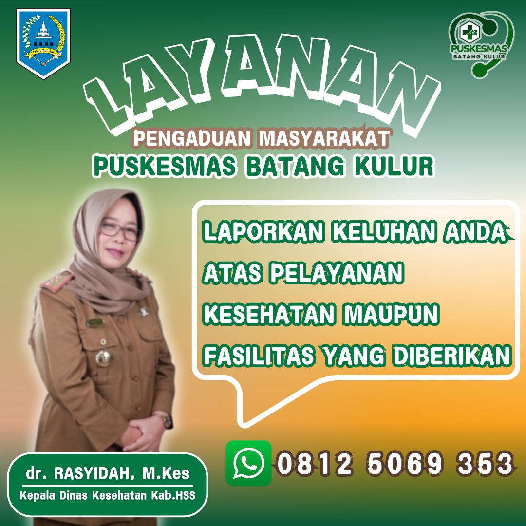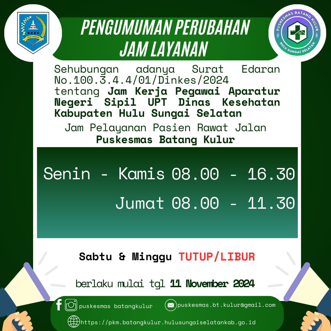 Sehubungan dengan adanya Surat Edaran Jam Kerja Pegawai Aparatur Negeri Sipil UPT Dinas Kesehatan Kabupaten Hulu Sungai Selatan No.100.3.4.4/01/Dinkes/2024, maka Puskesmas Batang Kulur melakukan perubahan hari kerja dan jam pelayanan pasien rawat jalan seperti yang tertera. Surat Edaran ini mulai berlaku hari Senin, 11 November 2024.