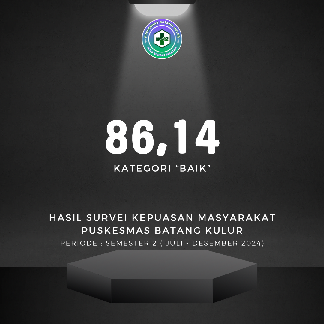 Hasil Survei Kepuasan Masyarakat Puskesmas Batang Kulur yaitu dengan nilai 86,14 kategori “BAIK” pada periode semester 2 (Juli – Desember 2024), dengan jumlah responden 100 orang terdiri dari 44 orang laki-laki dan 56 orang perempuan.