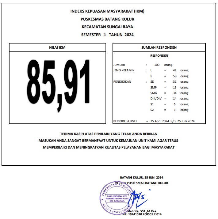 Hasil Survei Kepuasan Masyarakat Puskesmas Batang Kulur yaitu dengan nilai 86,14 kategori “BAIK” pada periode semester 2 (Juli – Desember 2024), dengan jumlah responden 100 orang terdiri dari 44 orang laki-laki dan 56 orang perempuan.